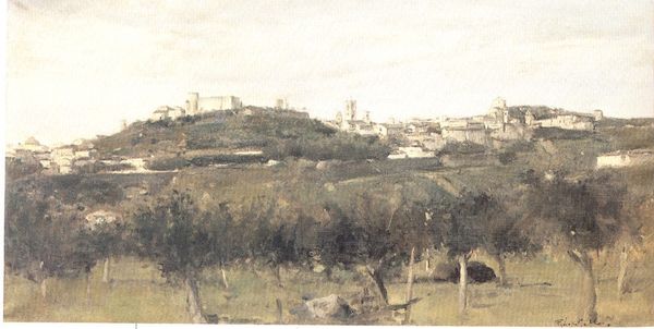 Curator: I’m struck immediately by the pervasive gloominess, that almost monochromatic palette... it feels incredibly still and quiet, wouldn't you say? Like time itself is holding its breath. Editor: Absolutely. We're looking at "Moonlight, Tetuan, Morocco," painted in 1911 by Sir John Lavery, who worked in that very particular late Impressionist style. The subject is this stunning, evocative cityscape rendered in oils. Curator: It’s interesting he called it moonlight, because it's not how you typically imagine moonlight. I see this smoky veil more than silvery brightness. There's a subdued drama about it though, you know? It is somehow compelling... Editor: Yes, that tonal harmony almost makes the moon, whatever its light, become symbolic of the artist’s internalized Orient. Orientalism was, after all, not simply about depicting a place, but also the Western gaze on that place. Lavery may not have intentionally done that of course. Curator: That’s an interesting point, how even a nocturne like this can be caught up in bigger questions about perspective. It feels honest though – he's not giving us exotic clichés; the scene looks genuine, observed and somehow felt. Editor: Lavery traveled to Morocco with his family. This work does speak volumes about a specific historical context, but there is a dialogue between authenticity and aestheticization at play here too. How does any Westerner truly see an "other" place and culture? It always runs through a lens, doesn't it? Curator: I'm always trying to imagine him painting this. It's open-air, plein air; must have been cold, perhaps challenging… Yet the result has this incredibly fragile touch. You almost expect it to dissipate before your eyes, like fog lifting off the city. Editor: The brushstrokes contribute greatly to that feeling—they’re very loose and broken. It certainly speaks of its era. Curator: What do you take away as a final thought from looking at this? Editor: "Moonlight, Tetuan, Morocco" remains a study in the complexities of representation, perception, and power – as relevant today as it was then. Curator: I'd just say the man had a fantastic knack for mood. It just gets under your skin somehow.