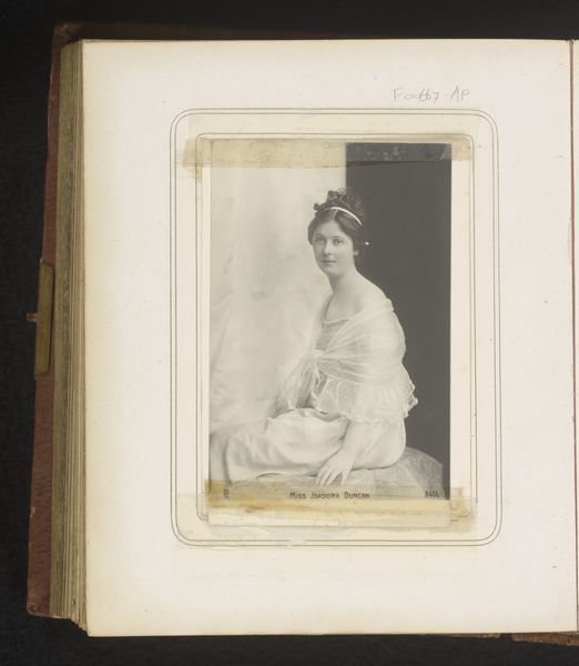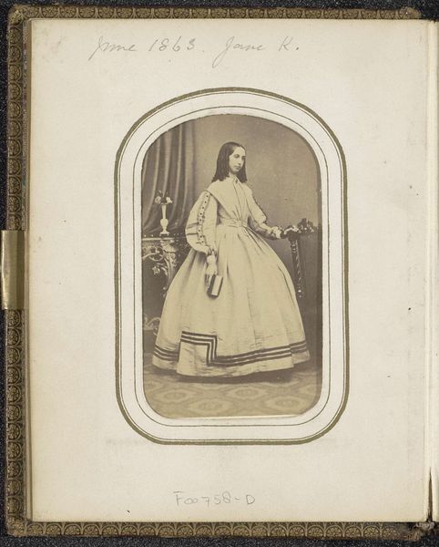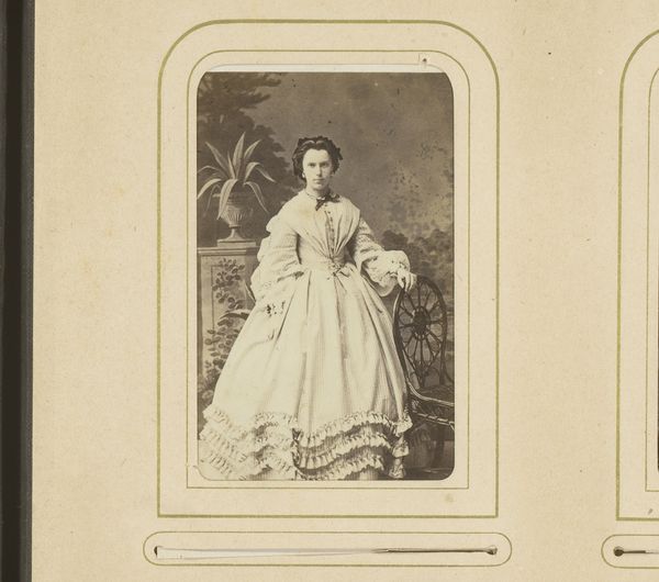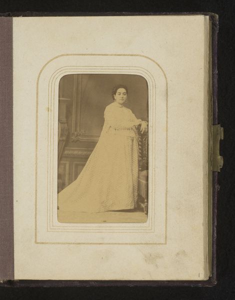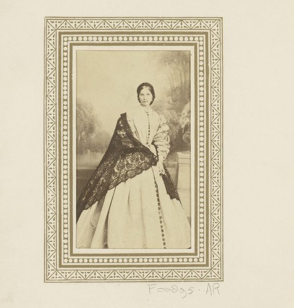 Curator: Here we have a photographic portrait of Alexandra of Denmark, later Queen Alexandra of the United Kingdom, taken sometime between 1864 and 1874 by Georg Emil Hansen. Editor: My first thought is how strikingly posed she is, almost defiant, yet elegant. The light falls so carefully on her dress, highlighting its elaborate construction. Curator: Yes, it's interesting to consider the performative aspect of such a formal portrait. Photography, while innovative, was also labor-intensive then. We can assume that both Hansen and his royal subject participated in constructing and capturing this image. Consider, for instance, the dress—it isn't merely fashion; it's a visual symbol, produced and worn within a very specific social context. Editor: Precisely! The dress itself—the fall of the fabric, the detailed ornamentation—is clearly meant to convey power and status through form. The relatively restricted grayscale palette makes these structural details more prominent, which encourages us to linger on the way she’s positioned and styled within the pictorial space. Curator: And how that image, initially crafted in Hansen’s studio, then circulated among social networks as material evidence of power relations. The photograph becomes a commodity itself. Editor: Indeed. But to pivot back to Hansen's formal choices—observe the way he balances Alexandra's figure with the light filtering through what appears to be a curtain behind her. He uses light and shadow to model her face, drawing our attention to her expression and posture. These decisions are what constitute the visual message beyond the status this photograph communicates about her social standing. Curator: Very true. It is also worthwhile pondering her attire—to recognize it as material culture that has been the product of labor to meet elite tastes, thus linking artistic endeavor and social and economic structures of production. Editor: Reflecting on the photo now, it strikes me how the interplay of form and symbolic value creates a truly arresting depiction. Curator: For me, the lasting impression is how this work embodies both artistry and broader implications on cultural meaning.