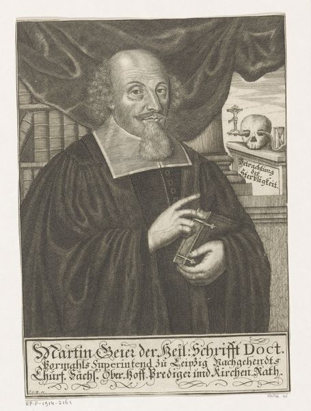 Curator: I find myself immediately drawn to the textural details in this 17th-century engraving. The overall impression is somewhat somber, a gravity reflected in the dark cloak and the subject’s focused expression. What stands out to you at first glance? Editor: It's undeniably impressive. It’s fascinating to see the detail achievable through the engraving process – all those fine lines carefully incised into the copper plate. I wonder about the engraver’s labor involved, the sheer time commitment for something like that curtain detail. Curator: Precisely! Let me introduce this as "Portret van Martin Geier," made sometime between 1680 and 1721 by Christian Romstet. Martin Geier was a prominent theologian. Notice how Romstet positions him: holding a substantial tome, a clear visual indicator of his scholarly pursuits and a common symbol of wisdom. The placement is clearly intentional. Editor: I am thinking about that book. The quality of the paper itself, that stark whiteness rendered in the print... Who made that paper, and what were the labour conditions like? Also that heavy inkwell - it’s clearly a valuable possession displayed deliberately in the image, broadcasting his access to material resources. Curator: True, the objects around him denote status and power, however there are other symbols as well. Think of the subtle way the light illuminates his face—it emphasizes his intelligence and spiritual authority. Consider that trimmed beard; it can denote piety and erudition in equal measure. The clothing does, too. His dark cloak and academic collar point to theological convictions but the draping curtain could indicate a royal patron. Editor: Absolutely, but what about that ink? Where did it come from and what did the raw ingredients involve? To create this image and disseminate his image through this medium also required significant infrastructure. Curator: Fascinating points about materials, as well as class and work relations. Thanks, this engraving really demonstrates how material realities interweave with symbolic representation to project authority and shape how we remember the individual! Editor: Yes, I agree. Considering it all adds layers to this portrayal that connect us to the economic and cultural conditions surrounding it.