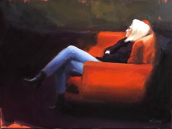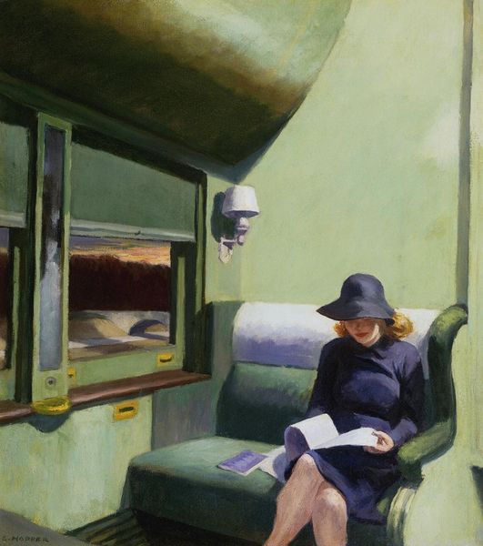 Vincent Giarrano painted this piece, titled *Woman on Train*, with oils on canvas. It appears to be painted in the early 21st century. Giarrano's work, capturing a solitary figure engrossed in a newspaper on public transit, speaks to the evolving social dynamics of the modern commute. The woman, isolated in her seat, is surrounded by symbols of contemporary life. Consider how the newspaper, a tangible medium in an increasingly digital age, situates her in a specific cultural moment. The scene is rendered with loose brushstrokes which seems to capture the fleeting nature of these ordinary, everyday moments. The composition of the painting, with its emphasis on the individual within the larger public space, invites us to reflect on the social conditions that shape artistic production. To fully understand this painting, you would have to study the cultural and political landscapes of the early 21st century, examining the role of mass media, transportation, and the shifting boundaries between public and private life.