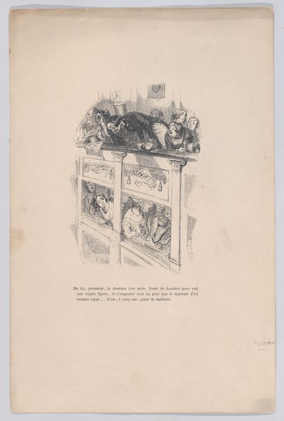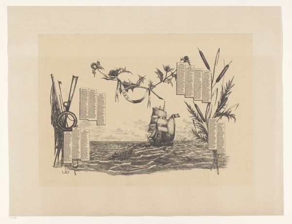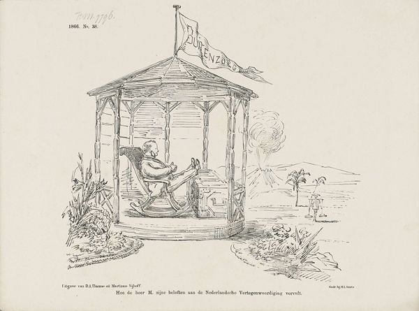 This is Johan Michaël Schmidt Crans' 1869 cartoon commenting on the replacement of Governor-General Mijer. Its composition is dominated by the stark lines of a gazebo-like structure, within which a man sits in a rocking chair, caught mid-motion, and is rendered in monochrome ink. The visual metaphor here is striking: a gazebo becomes a "wip-schopstoel," or seesaw, topped with a flag that reads "Bezorgh," which means "Care." The rocking chair suggests instability and the temporary nature of power. The man's precarious position and the seesaw allude to the political climate of the time. The stark lines and the cartoon's limited palette serve to distill the message, focusing our attention on the structural dynamics of power and governance rather than on superficial details. It highlights how seemingly stable structures can be easily upended, reflecting a deep engagement with the transient nature of authority. This is not merely a political jab but a meditation on the frameworks that govern society.