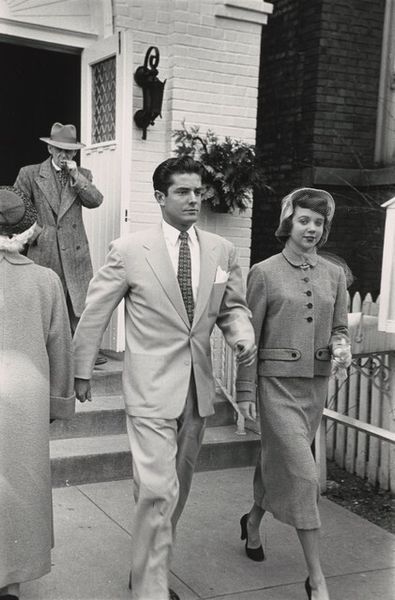 Curator: Harry Callahan's photograph "Providence," dating circa 1965, captures a seemingly candid moment in an urban setting. Editor: There’s a sharp, almost austere feeling. Stark shadows carve out the figures. What’s the material makeup, do we know what kind of film stock Callahan used? It’s crucial to the high contrast. Curator: Callahan was known for experimenting, so pinning it down is tricky. What strikes me is the emotional weight each figure carries, amplified by their expressions. The woman in the patterned coat especially seems laden with…something. Editor: It’s a textile landscape, isn’t it? The hard, defined edges everywhere--architecture of the everyday. That textured coat is screaming "1960s synthetic blend", mass produced yet offering a sense of individualized style within a certain class bracket. It's about constructed identities. Curator: Identities presented, definitely, but also identities revealed. Consider the doorframe looming, an architectural suggestion of threshold. Could this signify moments of personal transformation as we transit spaces, both physically and psychologically? The gaze from each figure has such an outward facing direction with what feels like interior depth. Editor: Possibly. Or simply that the setting, the city as a locus of consumption and production, dictates their roles. The image has very gendered overtones that are enhanced by those clothes. Think about how readily accessible fashion trends were becoming with new industrial techniques, influencing behavior, too. It suggests how the machine impacts individual style, ultimately constructing us all into units of labour and capital. Curator: An intriguing interpretation, certainly. It highlights the tension between the individual and the collective, manifested through external markers. For me, I'm held by the image of self each figure gives so intently. Editor: Ultimately, Callahan has left behind compelling evidence about our lives under post-war industry. What did it mean to be "modern," as recorded materially? Food for thought.