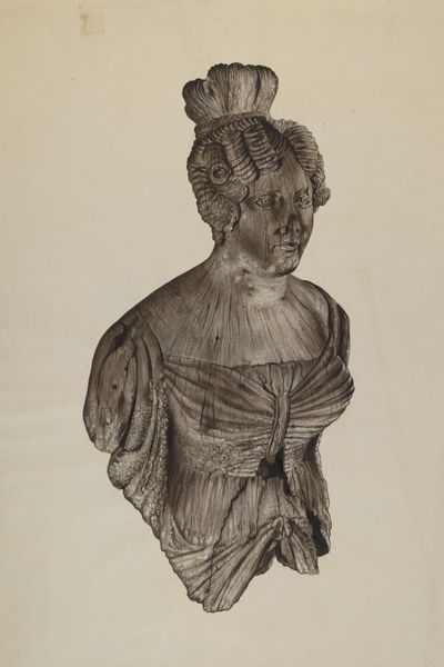 Alton K. Skillin made this drawing of a "Figurehead from Schooner "Polly" with what looks like watercolour on paper. It's fascinating how Skillin captures the texture of the weathered wood; you can almost feel the layers of paint peeling away. The blues and greys create a somber, almost ghostly feel, fitting for a figurehead that has probably seen many storms, and this gives the artwork a strong sense of history. I'm drawn to the face of the figurehead, where the paint has worn away the most, revealing the raw wood beneath. It's like looking at a portrait where time itself has become an active collaborator, and it reminds me of the work of Cy Twombly in the way it embraces imperfection and decay. Ultimately, this piece isn't just about representing a physical object, but also about hinting at how things change over time.