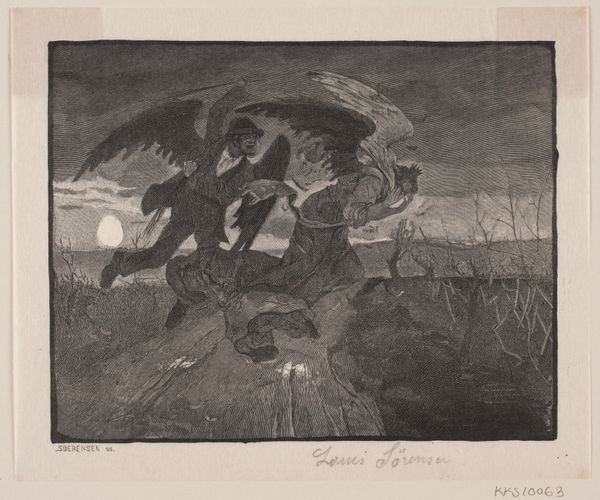 Editor: This is Frederic Remington’s 1892 drawing ‘Huskie’ Dogs on the Frozen Highway,’ and it appears to be made with pencil and ink. It depicts a person racing with a dogsled team across a snowy landscape under a full moon. What I immediately notice is the incredible sense of movement. The dogs, the driver—everything feels like it’s blurring forward. What do you see in this piece? Curator: This piece sings to me of endurance and the connection between humans and animals, visualized through deeply-held symbols of transit. Notice how Remington renders the dogs. Their musculature isn’t just about physical strength; it's a testament to their spirit. Each dog, even silhouetted, embodies a drive to forge ahead, echoing the determination of the driver. Do you see how the light of the moon seems less like illumination and more like a spotlight on their shared journey? Editor: I do, yes! The moonlight definitely sets a stark tone. Is that deliberate, in terms of its symbolism? Curator: Consider the moon as a recurring symbol throughout history and various cultures. Often, it signifies guidance, even through periods of darkness or uncertainty. Remington may be subtly communicating ideas of perseverance and resilience. Furthermore, in art history, light piercing through darkness may underscore concepts of hope and direction. The dogs, the driver, the sled -- all become allegorical figures within a larger narrative of the American frontier spirit. What emotional impressions do these visual choices have on you as a viewer? Editor: That connection to hope, yes, I think I see that. The determination seems more important. Thanks, I had not noticed that. Curator: Thinking about it, these symbols weave a more complex story. Hopefully, our viewers are also contemplating the layers present in Remington's choice of symbolism, and it will connect their own life and experience to the artwork.