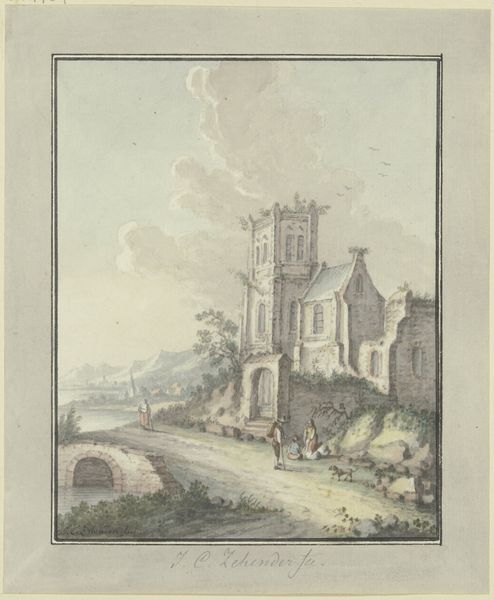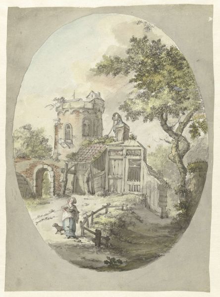 Curator: Paul Sandby, a key figure in the development of British watercolor art, created this piece titled "Travelers Entering a Town" sometime between 1751 and 1809. It’s currently housed here at the Metropolitan Museum of Art. Editor: My initial impression is one of gentle dilapidation. The pale watercolors create a sense of faded grandeur. I'm drawn to the texture of the aged walls and how it contrasts with the softness of the foliage. Curator: Precisely. Sandby’s interest lay in documenting the changing face of the British landscape and its built environment, particularly its architectural ruins and emergent urbanization, though he rendered it here in what seems like an Italianate fashion. Consider the rise of the Picturesque movement at the time, valuing irregularity and "naturalness." Editor: You can certainly see the influence. Look at the brushwork – so delicate, almost tentative. The watercolor medium itself allows for this beautiful transparency, which mirrors the dissolving authority of these aged structures and brings up thoughts of entropy. Curator: A good point about entropy, but I think that it's more nuanced than simple decay. Sandby often worked for wealthy patrons who wished to see themselves reflected favorably in depictions of their holdings. How might the depiction of ruin itself factor into elite identity? Editor: It brings me back to thinking of watercolor again – the ready availability of portable kits helped foster artistic markets that transformed who had access to art production. With watercolor, the wealthy now possessed a new tool to re-encode class and leisure in the British landscape. Curator: Fascinating. This points to watercolor's complex relationship to broader societal trends. It democratized access to art while, perhaps ironically, cementing existing power structures by rendering elite taste in tangible form. Editor: Absolutely. The light in the composition, seemingly captured directly, draws the eye toward the travelers entering the town. Sandby invites us to join the experience, too. Curator: So, in this rather subtle watercolor, we have converging aesthetic trends, economic forces, and the very specific circumstances of its creation—a glimpse into a world of art, patronage, and societal aspiration. Editor: I now understand the context better and can appreciate that watercolor is not merely a medium. Thanks! It represents a whole network of relationships: to labor, land, capital, and social value in late 18th century Britain.