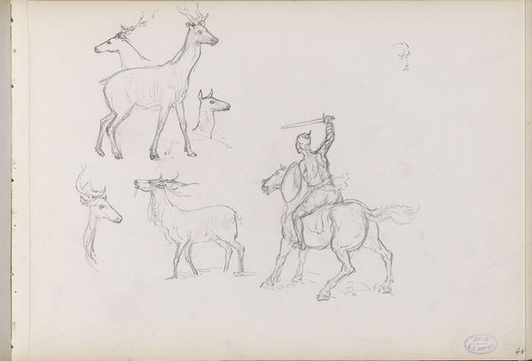 Editor: Here we have "Paardenhoofden en schetsen van soldaten," or "Horses' Heads and Sketches of Soldiers" by Georges Michel, created sometime between 1773 and 1843. It's a pencil drawing. It feels quite raw, like a study, but I'm intrigued by how the figures and animals seem to overlap. What do you see in this piece? Curator: I see a microcosm of societal power dynamics rendered through seemingly innocuous sketches. Look at the juxtaposition of the horses' heads, imposing and centrally located, with the smaller, more indistinct sketches of soldiers. Consider how Michel might be commenting on the roles of the military and the animals they used, within a societal structure built on hierarchy. What does this imply, do you think, about labour and social control? Editor: I guess it's easy to see the horse's power, as beasts of burden, next to the soldiers who would be dependent on them in battle. It makes you consider their interactions. Is it a sympathetic view of their co-dependence? Curator: Sympathy is a good starting point. Now consider the brutal realities of warfare during the period this was likely created. The Romantic period frequently idealized nature, but also saw industrial revolution. How might Michel be using these subjects to explore both themes? Are the horses symbols of raw natural power being exploited for human agendas? Editor: That's interesting, I hadn’t considered it that deeply. So the roughness of the sketch emphasizes the tension between romanticism and industrialization, reflecting on social inequality? Curator: Precisely. Art allows us to re-evaluate social structures, past and present. By engaging with these sketches, we open a dialogue on labor, class, and power – considerations vital even today. What new avenues does this open for you? Editor: I think it is about using our modern values to reinterpret artwork, seeing it as a commentary on something more timeless. Thank you!