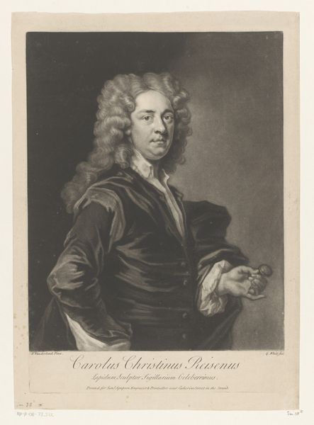 Editor: This engraving from 1731 by Christian Fritzsch, titled "Portret van Johann Friedrich Pfeffinger," has a really formal and almost imposing feel. All those tight lines, the elaborate wig... it definitely speaks to a certain era. What do you see in this piece? Curator: Well, the overwhelming presence of Pfeffinger's wig, precisely rendered in the engraving, acts as a potent signifier of status. The swirling mass becomes a visual representation of power and belonging to a specific social stratum. But does it also hint at something performative about identity, a masking or deliberate construction of self for public consumption? What cultural memory does this wig evoke? Editor: So the wig isn’t just a fashion statement, it’s loaded with meaning. I guess it also shows the sitter’s connection to a British identity. Curator: Exactly! “Britannicus” he is named as. Think about what visual symbols denote prestige at this moment. What makes you worthy of memorializing? Consider too how the text at the base mirrors the curls above. What is the symbolic significance of text in this kind of formal depiction? Editor: It seems like the inscription is almost grounding him – from those extravagant curls and that imposing status, he is anchored by text. It's about making him real. Curator: Precisely. He is a fixed identity. The portrait, as a symbolic object, seeks to preserve not just his image but his memory and impact. He looks like an anchor of the state. Editor: That connection between image and text really makes you think about how we build up identity, both visually and through language. Thank you. Curator: Absolutely! Exploring the ways symbols build individual and cultural narratives opens up so many avenues for understanding the past and present.