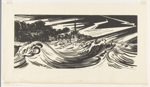 Curator: Here we have Bernard Essers' woodcut print, "Zee bij Bergen," dating from around 1925. What are your initial thoughts? Editor: It's striking how the stylized waves dominate the composition, like dark, rhythmic bands across the paper. The overall effect feels a bit theatrical, almost staged. Curator: The composition indeed has a performative quality, doesn’t it? Essers, influenced by the burgeoning modernist aesthetic of his time, crafted this print which captures not only the look, but also the feeling of the coastal region of Bergen in the Netherlands. This area became an important spot for artists. Editor: I notice that even though the lines appear simple, they give a real sense of movement and texture. Look at the small flourishes at the wave’s base. Also, that limited palette, the light blue, yellow, dark brown and ochre colors, they work wonderfully. It emphasizes a deliberate flattening of space, don’t you think? Curator: I do. And that flattening also mirrors a broader shift in the artistic landscape. This piece reflects a turn from academic representational art towards more stylized and socially engaged forms. Woodcuts were particularly suited to this era due to their relative ease of production and dissemination, allowing artists to engage with wider audiences. The scenes, sometimes satirical, would comment on current events or trends. Editor: The almost caricatured style of the seabirds seems very much of its time, and those sails on the horizon are simplified down to their bare essentials. The artist really seemed invested in the visual shorthand. Curator: Exactly. Essers manages to both depict and, in a way, critique the beach scene through a very conscious application of style. The print acted as a form of accessible social commentary. Editor: I appreciate seeing how he's balanced form and function. Essers makes aesthetic choices that support his engagement with the world around him. It invites closer looking. Curator: A perfect meeting of style, sentiment and society in one deceptively simple image. Editor: Yes, definitely one of those works that reveals more with each observation.