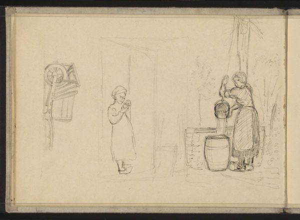 Cornelis Springer made this pencil drawing, "Figuren bij een afscheiding"–Figures by a partition–on paper. The artist has used a pencil, and the graphic economy of line suggests that this work represents a moment in time. It’s immediacy encourages us to think about the tradition of drawing as one that has evolved over centuries. Springer has captured a fleeting moment in the lives of working people, and we feel the weight of labor and production, captured in their seated pause. The artist’s choice of pencil on paper allowed for quick, precise marks that were also economical, reflecting the value placed on time and resources. Drawing as a traditional art form involved the mastery of tools and techniques, a skill in itself that has developed alongside other creative practices, reflecting the broader cultural and social contexts of their creation. Focusing on the materials and processes, the act of making art becomes more than just a creative pursuit, and the meaning is enhanced when we consider the social and economic conditions in which it was made.