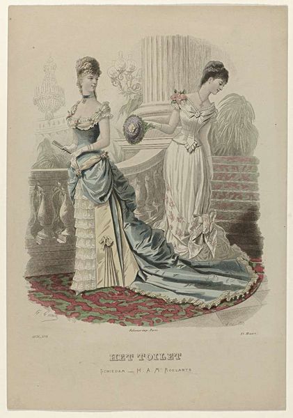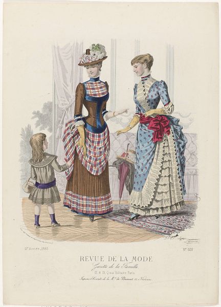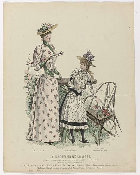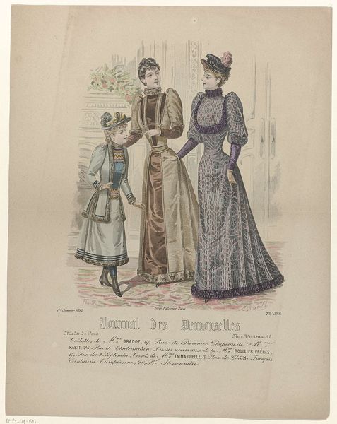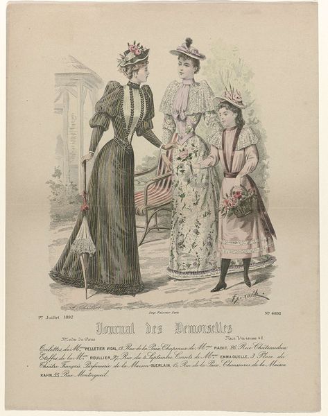 This print was made by P. Deferneville, and published in France as the cover for the Journal des Demoiselles in March 1899. The image offers a window into the fashion and social aspirations of the late 19th-century French bourgeoisie. The journal itself was part of a growing print media industry that catered to women, offering guidance on fashion, etiquette, and domestic life. This cover visualizes the idealized image of women and children as paragons of style and refinement. Note the carefully tailored dresses, elaborate hats, and the overall emphasis on elegance and grace. These details reflect the values of a society deeply invested in appearances and social status. We might ask, what role did publications like the Journal des Demoiselles play in shaping women's identities and aspirations during this period? A deeper understanding can be achieved by researching the history of fashion magazines, the rise of consumer culture, and the changing roles of women in French society. Art is always contingent on its social and institutional context.