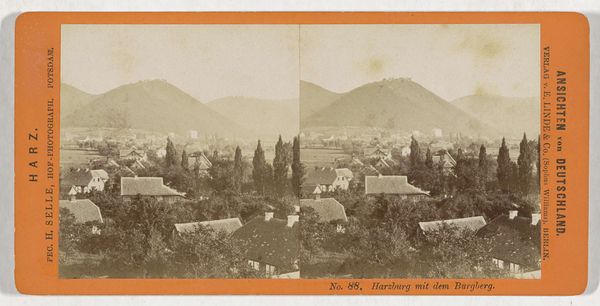 Editor: Here we have “Gezicht op Bad Harzburg,” a gelatin silver print by Laurentius Herzog, dating from around 1855 to 1880. There's something really intriguing about seeing a landscape captured so early in the history of photography. It has a slightly surreal, dreamlike quality due to the limited tonal range. What elements of composition really stand out to you in this piece? Curator: The stereoscopic format immediately captures my attention. Note how the slightly different perspectives in each panel work together. It seems almost engineered to highlight spatial depth. The symmetrical duplication offers a kind of emphatic clarity. Do you agree? Editor: I do. The framing emphasizes the contrast between the foreground detail and the blurred background mountains. So much is lost in that blur though. What visual relationships seem most potent to you here? Curator: Note how Herzog arranges the light and dark masses, from the shadowy foreground foliage to the paler village, capped by the diffused, mountain peaks. This graduation enacts an upward, transcendental movement. Do you also observe how the verticals of the trees punctuate the composition, adding a structural element? The arrangement contributes to an overriding sensation of idealized harmony. Editor: I hadn't considered the upward movement before. Thanks, that adds a new perspective for me! Curator: Of course. Paying close attention to Herzog's treatment of light and form yields much of what makes this such a visually rewarding photograph.