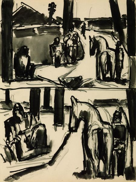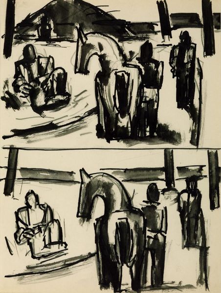 Editor: This is Josef Herman's "Two Separate Sketches, Each with a Pony at Right," a drawing of undefined date. I notice a distinct contrast between light and shadow; how do you interpret the figures and their relationship to the ponies? Curator: The pony, a recurring motif, often symbolizes freedom and untamed spirit. Notice how the figures, rendered in stark contrast, are tethered to the animal, or each other, suggesting a complex interplay of constraint and liberation. What feelings does this evoke? Editor: That the ponies' freedom contrasts with the people's more restrictive environments. Curator: Precisely. It may reflect societal or personal limitations, the unspoken ties that bind us, creating a powerful visual narrative about human existence. I find the ponies are a cultural memory in this work. Editor: Yes, that helps me understand the layered meanings beyond the initial sketch.