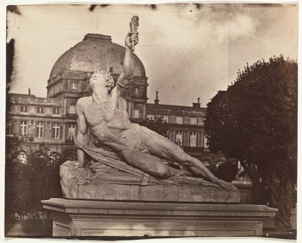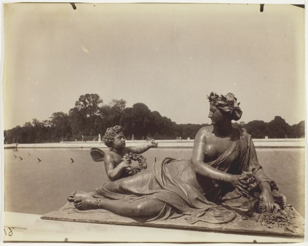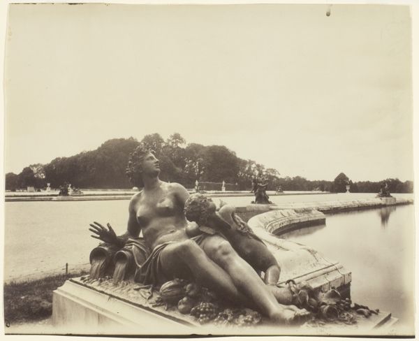 Eugène Atget captured this image of ‘Versailles, Le Rhône par Tuby’ using the albumen silver print method. Here we see a sculpture of a river god, a classical motif symbolizing power and abundance through the ages. This figure, with his muscular physique and flowing beard, embodies the vitality of the Rhone river itself. Consider his serene expression, mirrored in countless depictions of gods and heroes across time. The scepter he holds is reminiscent of Zeus’s thunderbolt or Poseidon's trident, underscoring his dominion. Similar figures, often associated with rivers or seas, appear across different cultures, from ancient Roman fountains to Renaissance paintings. These images evoke an awareness of our profound connection with the natural world. This enduring symbol, reborn time and again, taps into a deep well of collective memory, reminding us of humanity’s continuous dialogue with its environment.