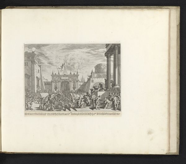 Editor: Here we have Melchior Küsel’s “Intocht in Jeruzalem,” made sometime between 1670 and 1682. It's an engraving, a print, and the sheer number of figures packed into this scene is really striking! It's like a bustling landscape filled with tiny figures. What can you tell me about the cultural significance of this imagery? Curator: Well, the ‘Intocht in Jeruzalem’—the Entry into Jerusalem—is not just a historical event; it's a potent symbol laden with religious and political implications. Note the palm branches. What do they signify to you in this context? Editor: I guess...victory? Recognition of someone important? Curator: Precisely. Palm branches, since ancient times, represented triumph and royalty. By including them, Küsel evokes this sense of acclaim. Think of the cultural memory embedded in this scene – the cheering crowds, the anticipation of a new era, but also, a foreshadowing of the events to come. How does the cityscape in the background influence your interpretation? Editor: It feels very classical. Like a stage or backdrop. Maybe it emphasizes the magnitude of this entrance, with the city as a kind of witness? Curator: Indeed. The architectural elements give weight to the event. Consider also how prints like this circulated – disseminating not just an image but a specific interpretation of faith, power, and historical narrative. Editor: So it’s about layering the event with recognizable symbols to ensure the story resonates across time. Curator: Exactly. It’s fascinating to consider how visual symbols can sustain meaning, morph through cultural lenses, and affect viewers centuries later. It encourages me to be attentive to how and what these symbols transmit through culture. Editor: That's an interesting approach - thank you for sharing it with me!