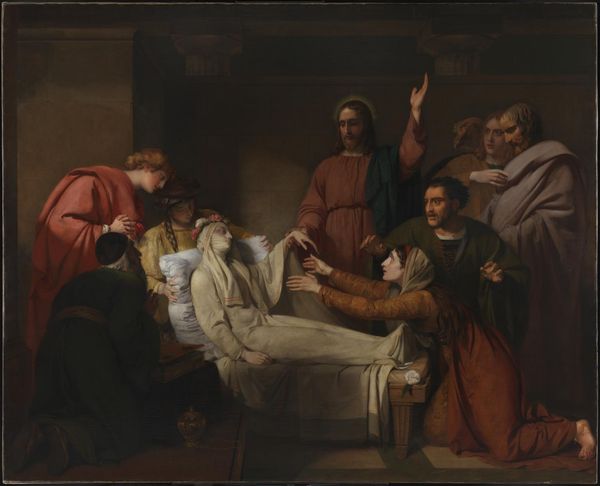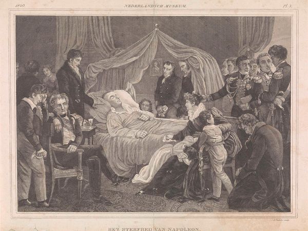 Charles de Steuben painted this depiction of Napoleon's death, capturing the scene with symbols of mortality and legacy. Central is the figure of Napoleon himself, laid out in repose, akin to the classical motif of the fallen hero. The image speaks to a grand narrative of loss. Consider the weeping figures surrounding Napoleon, gestures of mourning that echo across centuries. The motif of grief can be traced back to ancient Roman funerary art. In the painting, the poses of bereavement are carefully constructed to evoke empathy, a visual shorthand for shared human experience. This harks back to ancient Greek tragedies, where the chorus embodies the collective emotional response. The deathbed scene taps into our collective unconscious. It serves as a potent reminder of mortality, loss, and the cyclical nature of human experience. The symbols of death in the image invite us to reflect on the transience of power and the inevitability of fate. The echoes of this image reverberate through art history.