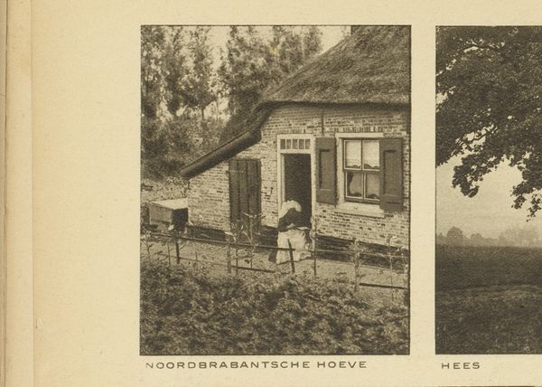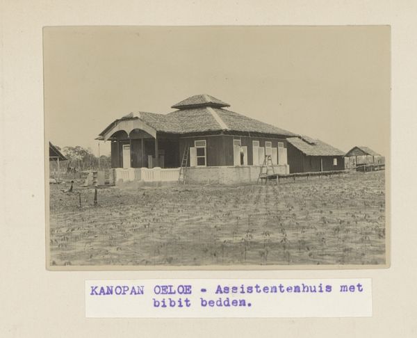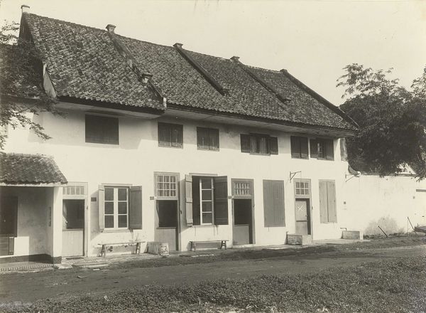 This photograph, entitled "Leidong West - Hospitaal," captures a hospital building in subdued monochrome tones. The building's architecture, defined by a thatched roof, is the central visual element. The composition reveals a study in contrasts; the dark lower portion sharply opposes the light upper section. These bold horizontal bands create a visual tension, destabilizing any sense of a clear hierarchy within the image. The figures, almost camouflaged against the building's facade, further complicate the spatial arrangement, challenging a straightforward reading of depth and perspective. This interplay between light and shadow, coupled with the flattening of space, invites us to consider how the photograph itself functions as a sign. Does it reinforce colonial-era hierarchies, or does its formal construction offer a subtle critique? Perhaps it does both, leaving us to ponder the complexities of representation and power encoded within the image.
