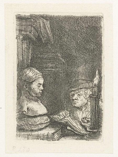 Curator: Here we have Rembrandt van Rijn's etching, "Man Drawing from a Cast," currently housed at the Harvard Art Museums. Editor: The candlelight sets a rather somber tone. It's incredible how much detail Rembrandt achieves on such a small plate. Curator: Absolutely. Consider the symbolism of artistic reproduction during a time when access to art education was limited. Drawing from casts was a means of democratizing art. Editor: Notice how the cross-hatching creates such depth, especially in the background. The artist’s intense focus is palpable, reflected in the tight grip on his drawing tool. Curator: And let’s not overlook the bust itself. Its presence raises questions about representation, race, and the gaze—who is given the right to be depicted, and by whom? Editor: Yes, the rendering of light and shadow definitely highlights the textural contrasts between the plaster bust and the artist's aged features. Curator: It encourages us to think about the power dynamics inherent in the act of artistic creation and the social implications of studying and depicting diverse visages. Editor: Rembrandt's attention to detail really invites us to focus on the foundational elements of art-making and how light, form, and material coalesce. Curator: I find myself considering how this image might have challenged or reinforced social hierarchies of the time. Editor: A compelling point. And from a purely formal perspective, it's a masterful demonstration of light and shadow.