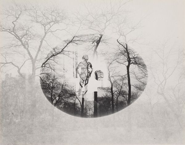 This is Harry Callahan's 'Eleanor, Chicago', a gelatin silver print. What I love about it is the way Callahan layers images, creating a space that feels both intimate and fragmented. Look at the stark contrast between the black tree branches and the bright, torn-paper shapes. These shapes aren't just abstract forms; they feel like emotional disruptions, like pieces of a memory that refuse to fit together neatly. The figure of Eleanor, caught in a moment of quiet contemplation, is almost swallowed by the chaotic yet beautiful composition. The details are really striking - the way the bare branches intermingle with the woman's figure and the architecture of the building behind her create this layered effect. Callahan reminds me a little of Robert Frank, both of them capturing something so honest and immediate in their work. Ultimately, art is about asking questions rather than providing answers.