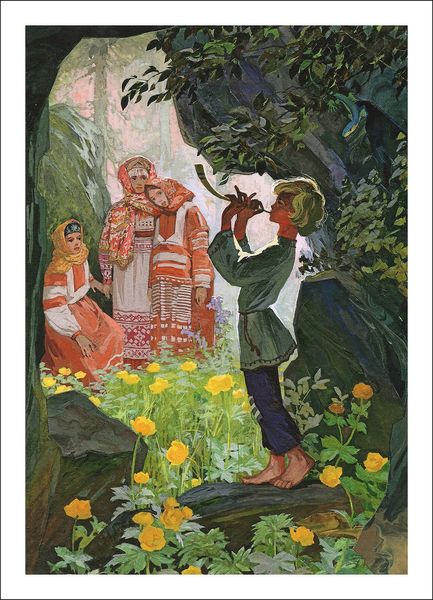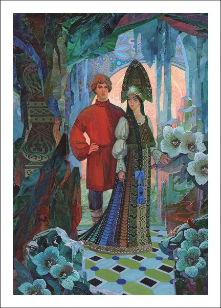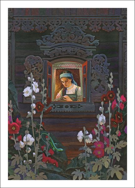 Vyacheslav Nazaruk created this illustration for "The Tale of the Dead Princess and the Seven Knights" using watercolor to capture a moment of serene fairytale wonder. The composition is neatly framed with decorative motifs that pull the viewer into an enchanting scene. The artist organizes the pictorial space using vertical and horizontal lines, which structure our reading of the image. The verticality of the birch trees, with their slender white trunks, contrasts against the horizontal layering of the forest. Notice how this contrasts with the princess's figure, whose vertical presence interrupts the natural backdrop. The formal arrangement isn't just aesthetic, it's narrative. Nazaruk's use of color functions here as a semiotic code, the blues and greens evoke the quiet stillness of the woods, while the reds draw our eyes to the princess. The contrast of light and shadow, along with linear details, brings the image to life. In this way the artist uses form and structure to create an intriguing visual experience for the viewer.
