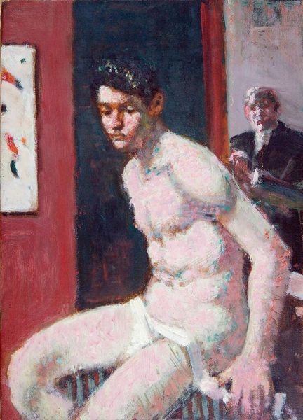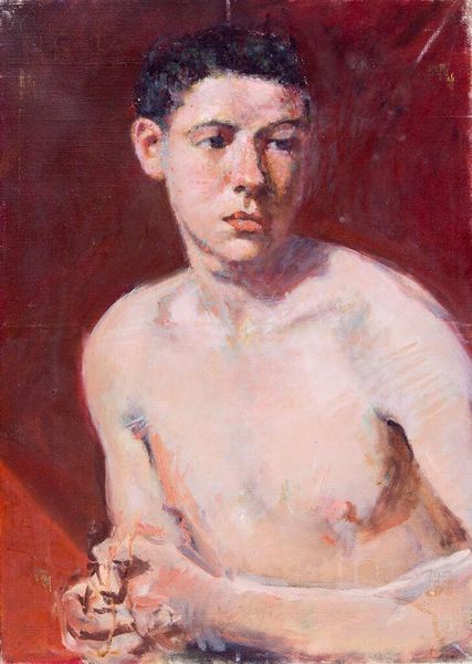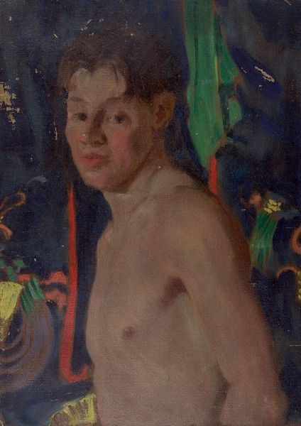 Curator: Here we have Denman Waldo Ross’s “Portrait of a Shirtless Young Man,” held here at the Harvard Art Museums. Editor: The texture jumps out—you can really see the thick, almost hasty brushstrokes, especially on the figure’s pale skin. It feels immediate, process-driven. Curator: Ross was deeply involved in art education and the promotion of aesthetic principles. This piece, in its rendering of the male figure, speaks to a longer tradition of academic figure study. Editor: But look closer – there's a rawness here that goes beyond mere academic exercise. The materiality of the paint, the almost brutal application, challenges the idealized form we often associate with such studies. Curator: I agree, and it seems that this painting is part of Ross's larger interest in color theory and design, particularly influenced by his role in shaping the collections of the Museum of Fine Arts, Boston. Editor: It’s intriguing how the visible labor, the physicality of applying paint, adds to our understanding of the portrait itself. A revealing glimpse, indeed. Curator: An artistic choice that really speaks to the evolving attitudes towards art and representation.