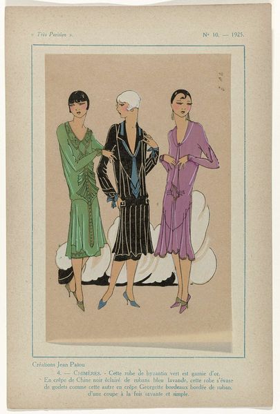 Editor: Here we have "Très Parisien, 1926, No. 1, Pl. 8 - Neigeuse" by G-P. Joumard, a drawing from 1926 currently held in the Rijksmuseum collection. My initial impression is that the artwork really captures the fashion trends of the Roaring Twenties. What elements jump out at you when you look at it? Curator: Ah, a little flapper triptych, perhaps? What delights me about these kinds of fashion plates, and this one is particularly yummy, is the fantasy element. These women don't *really* exist, not like that. They’re a carefully constructed dream, selling not just clothes, but a lifestyle, a feeling. Notice how they're not individualized—more archetypes than portraits. Does that ring true for you? Editor: Absolutely! They are more like ideals than real people. I also notice the distinctive Art Nouveau style. It's quite elegant. Curator: Elegance, but with a bit of an edge. The slight awkwardness in their poses, the elongated limbs—it’s all very deliberate. It hints at the break from Victorian stuffiness, that delicious tension between wanting to be proper and wanting to dance the Charleston all night. Do you think it achieves that? Editor: Yes, definitely! The colours, too, contribute to that feeling. There is something so playful about the colour palette and use of watercolors. Curator: Exactly! And think about who was consuming these images. Women, mostly, yearning for something new, something liberating. It's a little window into their desires, don't you think? A powerful and often overlooked corner of art history, if you ask me. Editor: I agree. I've learned to appreciate the subtleties within what might seem like a simple fashion plate, understanding the dreams it represents. Curator: Indeed, a glimpse into a very particular Parisian dreamscape. One with hemlines rising and spirits lifting!