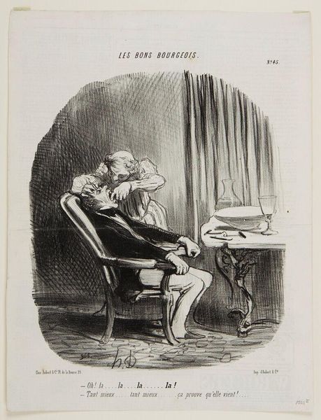 Curator: Honoré Daumier created this lithograph, “Oh! la... tant mieux... ça prouve qu'elle vient!,” in 1847, part of a series portraying "Les Bons Bourgeois." Editor: Oof, talk about a bad day at the dentist! The raw emotion captured here—that exaggerated, open-mouthed grimace—it’s instantly relatable, even across centuries. You can practically feel the discomfort. Curator: Daumier wields caricature as social critique, and his "good bourgeois" are often figures of fun. It’s important to note the print appeared during a period of significant social and political upheaval in France, so this isn't just dental work. Editor: Absolutely, there’s a deeper satirical layer. The subject’s obvious distress is almost slapstick funny. The rigid posture in that chair just heightens the awkwardness and suggests, maybe, a certain societal rigidity too? The artist really manages to convey the suffering! Curator: Exactly. This work exposes class anxieties of the era, and invites viewers to consider how power dynamics manifest even in ostensibly banal, domestic spaces like a dental appointment. It speaks to the discomfort inherent in the societal hierarchies of the 19th century. The fact that he is being tended to, potentially by someone from a lower class, adds an element of social critique. Editor: I think the way the lithograph medium lends itself to strong contrasts really heightens the emotional intensity. The lines, especially around the patient’s face, feel almost frantic. Is that a tear welling? It really pulls you in. Maybe this piece tells the audience a great deal about its creator, and what kind of anxieties Daumier may have held himself at this time. Curator: It makes you think about anxieties experienced by different people today too. Thinking about modern issues like healthcare, gender dynamics, and access to resources can illuminate how different historical struggles mirror and depart from the contemporary moment. Editor: Yeah, definitely not something I expected to get out of what seems like a simple little tooth-pulling scene! I’m never going to look at lithographs the same way, and may feel less concerned next time I go for my own dental check up.