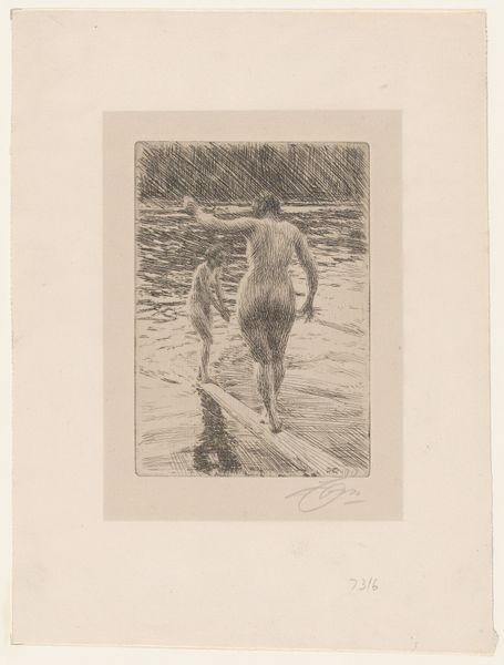 Anders Zorn made this etching, Sandhamn, using metal plate, mordant, and paper. In this process, the image is incised into a metal plate, acid-etched to deepen the lines, inked, and then printed onto paper, resulting in a reversed version of the original design. Here, the material—the very fine lines that the etcher is capable of making—influences the appearance of the work. Look closely, and you can see how these linear strokes create the composition's tonal range, the textures of the rocks and water, and the form of the figure. Etching is a relatively democratic medium, as prints can be editioned, allowing the artwork to be disseminated widely and sold at a lower price point. Zorn had to be a master draughtsman to achieve this level of control. The process involved a combination of technical skill and artistic vision. By exploring the possibilities of etching, Zorn blurred the boundaries between traditional fine art and craft, and democratized access to art, and to the female nude.