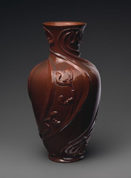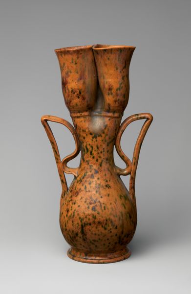Editor: This is "Vase with handles" made between 1877 and 1887 by Christopher Dresser. It's a ceramic sculpture, currently housed at the Metropolitan Museum of Art. The warm tones and unique shape of this piece make me feel like I'm staring at something ancient and otherworldly, especially how the artist worked with ceramic. What aspects of its construction or form do you find most striking? Curator: Note the strategic positioning of the handles, or "arms", diverging at nearly right angles before resolving into decorative swirls. Their placement provides a stark geometrical contrast to the vase's otherwise curvaceous silhouette. Moreover, the subtle variation in glaze application produces a nuanced chromatic topography, modulating the perceived depth and surface texture of the object. The artist manipulated the viscosity and spread of the glaze for maximum effect, and even the bubbles in the glaze suggest intention rather than accident. Don't you think? Editor: I see what you mean, and I definitely think those bubbles add more to the aesthetic than if it were a flat expanse of color. How do these visual elements contribute to the overall aesthetic impact of the piece? Curator: The success of this vase resides in the artist's acute understanding of form and color, achieving a complex unity out of disparate geometrical elements and surface effects. In the construction of its form we also cannot ignore the lack of a clearly defined symmetry which could contribute to the viewer's impression that it could "come to life". The non-Euclidean form challenges any attempts at fixed interpretation. It exists in a perpetual state of becoming. Editor: I can see now how all these aspects work together. I didn't think a vase could be so structurally engaging, or philosophical, before! Curator: Indeed, the confluence of surface and structure offers an inexhaustible subject for further exploration.