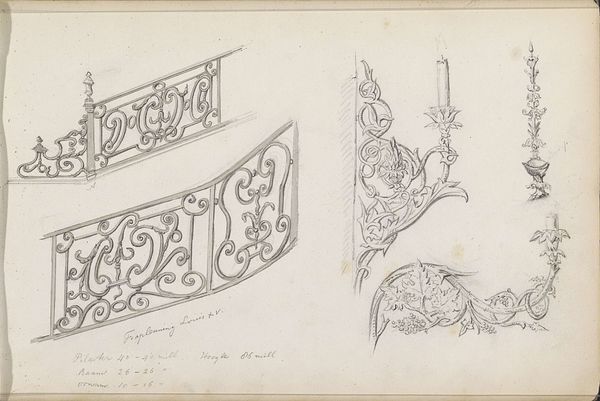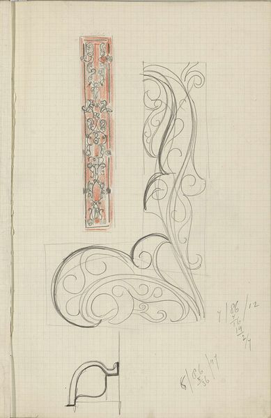 Editor: This drawing, "Bloemornament," created between 1884 and 1952 by Reinier Willem Petrus de Vries, is a beautiful example of Art Nouveau. The pencil lines are so delicate, yet they create these very defined geometric, floral shapes. It's like a blueprint for something larger. What strikes you about this piece? Curator: The beauty of a work like this resides in understanding the materials, the process of its creation, and its relationship to a larger social context. As a sketch, it likely served as a preliminary design. Considering the Art Nouveau movement, it's fascinating to think about how this drawing might have informed industrial production. Editor: Industrial production? Curator: Absolutely. Art Nouveau aimed to bridge the gap between fine art and design. We can appreciate this "Bloemornament" not just as a drawing, but also for what it reveals about the artistic labor involved in crafting everyday objects. Editor: So, you’re saying this could have been intended for mass production? Curator: Potentially, yes. Consider the geometric elements alongside the floral. This could easily have been translated into patterns for textiles, wallpaper, or even architectural details. We might ask: where were drawings like these made, by whom, and for what purpose? Were they individual artisans, or part of a larger studio producing designs for commercial clients? Editor: That’s fascinating. I was so focused on the aesthetic, I hadn't considered its potential use and implications in industrial manufacturing. Curator: It really pushes us to examine art outside the gallery context, understanding it as a part of the broader cultural and economic landscape. Editor: I see it now. Looking at it from a materialist perspective really opens up the interpretation. I will not think about decorative patterns the same way again. Curator: Exactly. We began with form and now can see all of the societal issues interwoven into this drawing on paper.