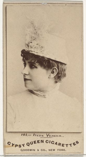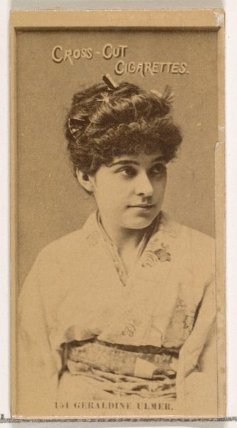 Curator: What immediately strikes me about this portrait is its palpable warmth. The sepia tones give "Card 649, Miss Emerson" a certain antique quality, inviting you into another era. There's something so intimate about it. Editor: Intimacy born of industry! This promotional print, made between 1885 and 1891 by Allen & Ginter for Virginia Brights Cigarettes, exists because of new manufacturing technologies and evolving ideas about advertising and mass consumption. It blurs the line between art and marketing. Curator: Interesting! She gazes softly to her left. Is that demureness, or knowing what’s to come? It reminds me of those photo booth strips from carnivals, moments plucked and recontextualized to hawk tobacco products. But how extraordinary, don’t you think, that mass production creates moments that linger as objects of artistic and social historical analysis? Editor: Exactly. This wasn't fine art in the traditional sense but a product of its time, indicative of shifts in labor and leisure. Look at the way print and photography blend – colored pencil detail enhancing photographic reproduction. Consumption fueled its creation, influencing both artistic and industrial processes. How does that industrial process change our viewing? Curator: It casts the idea of artistic genius as an old, tired idea, in my mind. The gaze she offers could lure potential clients in...or perhaps mock them for their susceptibility to a well-crafted fantasy. The tension of that uncertainty… delicious, really! Editor: I think that fantasy lies in the conflation of art, celebrity and capital, each reflected and reinforced by material conditions. How interesting it is to examine what a portrait such as this represents. We see Miss Emerson and her era, both filtered through consumer products. Curator: Ah, the layered depths of what looks on the surface to be merely quaint! Thanks to a portrait of an actress reproduced for tobacco products, a small, simple image opens us up to wider, much more complex explorations. Editor: Absolutely. And considering how everyday this image once was, now as a surviving historical and cultural object in the Met collection, it prompts deeper contemplation of the intertwining paths of artistic, material, and economic value.