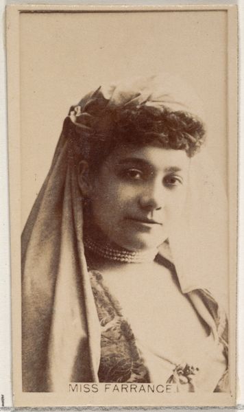 Editor: This is "Card 814, Louise Paullin, from the Actors and Actresses series (N45, Type 2) for Virginia Brights Cigarettes" made between 1885 and 1891. I see that it’s a print that resembles a pencil or charcoal drawing on toned paper. It feels very formal and staged to me, almost like a theatrical tableau. What stands out to you when you look at it? Curator: The image is pregnant with signs that speak of both celebrity culture and mass production. We see this portrait of Louise Paullin, presented not just as herself but as a carefully constructed character. Note the ornate headpiece and costume – these are symbols, markers of status and role-playing that were meant to be immediately recognizable to the consumer. But ask yourself, is it truly about art, or is it a symbol co-opted for the promise of a lifestyle through consumption? Editor: That's an interesting perspective. It does make you think about the use of imagery for selling products and ideas. Do you think the symbolic power is diminished because it's an advertisement? Curator: Not necessarily diminished, but certainly re-contextualized. The cultural memory associated with the iconography of "the actress," of stardom itself, becomes linked to the act of smoking Virginia Brights. It’s a powerful form of association, and it demonstrates the subtle ways consumer culture can influence and re-shape our understanding of historical archetypes. It also reminds us that what seems timeless is often a product of its time. Editor: It’s almost like celebrity endorsements haven’t changed that much. It really makes me think about how we give images and symbols their meaning. Curator: Precisely. And how those meanings can be molded, directed, and commodified. This seemingly simple card holds within it a complex story of culture and commerce.