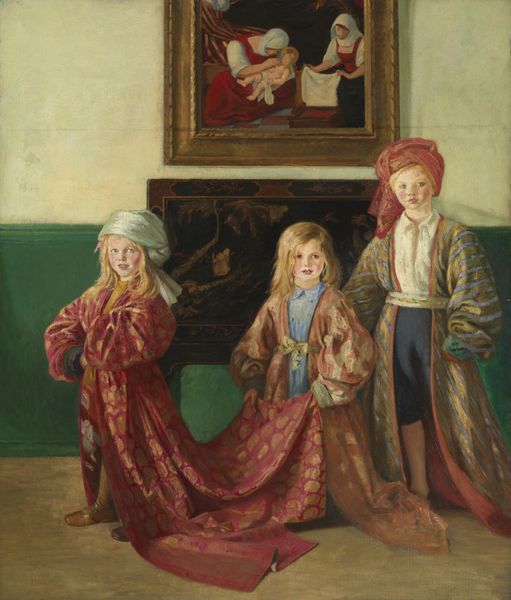 Editor: Here we have Joshua Johnson's "The Westwood Children," created in 1807. It's an oil painting depicting three children, rather stiffly posed, and a dog with a bird. There's something both charming and unsettling about the composition... What strikes you most when you look at this painting? Curator: It’s fascinating to consider this work through the lens of early American portraiture, especially regarding race and representation. Joshua Johnson was the first African-American professional painter in the United States, a remarkable feat considering the pervasive racism of the period. Looking at these children, do you consider how their very representation in a painting signifies privilege? Editor: Definitely. Knowing about Johnson’s background, it’s impossible to ignore the power dynamics at play. He's painting wealthy, white children in a society that systematically oppressed Black people. Was he making a statement, or was it simply a job? Curator: That's the crucial question, isn't it? Was he subverting the genre from within? The children are presented with markers of wealth – their clothing, the flowers, even the dog signifies leisure. I think Johnson may have been making strategic decisions to ensure commissions, whilst subtly challenging prevailing racial and social hierarchies. Do you see a possible critique embedded within the composition itself? Editor: It’s subtle, if it’s there. Perhaps in the almost unnatural stillness? They don't seem like happy children, more like possessions on display. Maybe that’s Johnson’s quiet commentary on the lives of the privileged. Curator: Exactly! Their formality contrasts sharply with the idea of childhood innocence we might expect. This painting is rich in historical context that compels us to engage in conversations about class, race and power structures in early America. Editor: It's incredible how much more there is to unpack once you start looking at it through that lens. It goes beyond just being a portrait of children from the 19th century.
