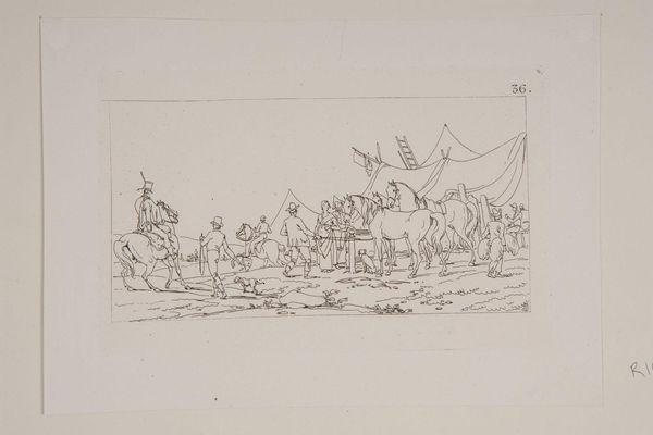 Curator: This is "Plate XXXI" by Jacques-Francois-Joseph Swebach, residing here at the Harvard Art Museums. Editor: It feels light, airy... a fleeting moment. The thin lines give a sense of speed. Curator: Indeed. Hunting scenes like this were popular, reflecting aristocratic pastimes and the social hierarchies of the time. Note how it elevates a leisure activity to a spectacle for public consumption. Editor: And the symbols! The stag, representing wildness and freedom, chased by the dogs and riders... it speaks to a deeper, almost primal conflict. Curator: It is very true. The hunting scene, in its very essence, reflects the taming of nature and the reinforcement of social order through symbolic dominance. Editor: Makes you think about the long echoes of those power dynamics, doesn't it? Curator: It does provide a lens through which to view our own relationship with nature and each other, still.