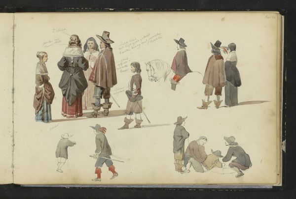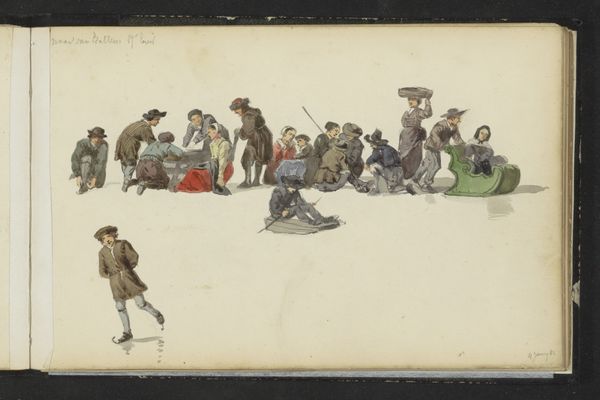 Editor: This work, “Figuren in zeventiende-eeuwse kleding”, or “Figures in Seventeenth-Century Clothing,” is a drawing in watercolor, pencil, and colored pencil on paper, possibly from 1882, by Cornelis Springer. It looks like a social scene, maybe even a snapshot of daily life, with figures ice-skating. How would you interpret it? Curator: Seeing Springer use these combined media – watercolor, pencil, and colored pencil – allows us to consider artistic labor and material production in a new light. We must ask: How does this particular combination of readily available and relatively inexpensive materials inform our understanding of 19th-century art markets and consumption? Editor: Interesting. So, instead of focusing on the image itself, you are more interested in how he made it and why he used these materials. Curator: Exactly! Consider the accessibility of watercolor versus the more precious medium of oil paint. Does the choice democratize art-making, or perhaps reflect a changing role for drawings outside academic tradition? We also should consider the mass production of paper in the 19th century, and what affect such innovation in material sourcing has on an artist's output and choice of representation. Editor: I never thought about that! Now I'm wondering if the clothing suggests a specific socio-economic class engaging in leisure, or a deliberate reconstruction for the consumption of a certain 19th century art audience. Curator: Precisely. Springer's work provides insights into both 17th and 19th century material culture and its consumption and production. Thank you, these kinds of consideration are necessary to re-evaluate artistic creations.