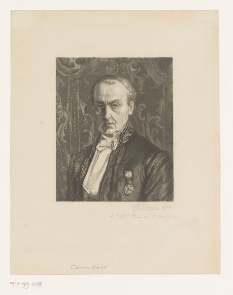 Curator: Immediately, I notice the sitter's gaze; it's piercing, isn't it? A portrait demanding attention. Editor: Indeed. Let’s provide some context. This is an 1879 engraving by Auguste Danse, titled “Portret van de heer Courtois, provinciaal inspecteur van het lager onderwijs in Hainaut.” The portrait depicts Mr. Courtois, the Provincial Inspector of Primary Education in Hainaut. It’s held at the Rijksmuseum. Curator: The medium certainly adds to the severity. That monochrome palette seems deliberate, focusing on shape and texture. Observe how the light plays across his face, drawing our eye to his expression. The tight lines seem perfect for rendering his dignity. Editor: The work really speaks to how social standing was represented and reproduced through print media. These engravings were not merely artistic exercises, but tools for establishing and circulating power. Think about the engraver's skill here; a highly specialized, often unacknowledged labor creating a durable and widely distributed image of authority. Curator: True, but let's consider Danse's artistic choices. Notice how the details in the background drape and clothing contrast sharply with the clarity of the face. There's a calculated use of light and shadow, guiding us to interpret this man a certain way. I wonder if Courtois commissioned it to signal the authority that you speak of. Editor: Undoubtedly, though my attention goes to the socio-economic dynamics in play. An educator rendered into durable, reproducible form speaks of accessible education. Consider, too, who could afford engravings like this. Access, even to imagery, reveals power structures. The act of printing, the paper it’s on... all materials embedded with meaning, influencing reception. Curator: An excellent point. These visual elements do guide our understanding of the subject, as does considering its material accessibility. Editor: Agreed. Thinking about the materials alongside Danse's artistic choices really adds a new depth to this representation. Curator: Indeed. Thanks to this lens, it has provided another view for analyzing power in representation.