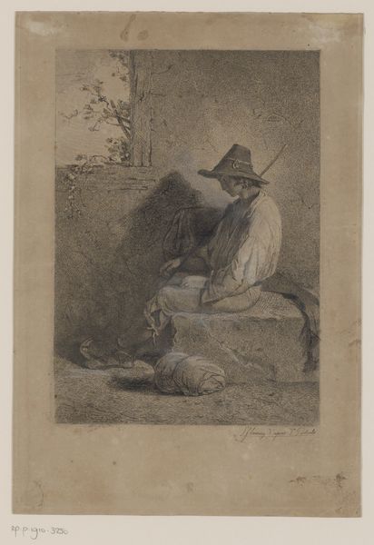 Jacobus Ludovicus Cornet created this print, "Resting Traveler," using etching, a process that’s all about line and tone. In etching, the artist covers a metal plate with a waxy ground, then scratches through it with a needle to expose the metal. The plate is then bathed in acid, which bites into the exposed lines, creating grooves. Ink is applied, filling these grooves, and then the surface is wiped clean. When paper is pressed onto the plate, the ink transfers, resulting in a print with crisp, delicate lines. Look closely, and you'll see how Cornet used this technique to create a sense of depth and texture, from the rough stone of the cave to the soft fur of the dog. The very act of etching, with its reliance on skilled handwork and repetitive actions, speaks to the value placed on craftsmanship and artistry in the 19th century. It reminds us that art is not just about the image, but also about the labor and skill that goes into its creation.