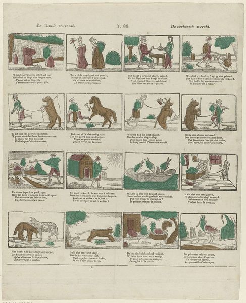Editor: So, here we have an etching from between 1822 and 1849, “Zoo kan het fabeldicht u leeren en vermaken…” by Jan de Lange II, currently residing at the Rijksmuseum. It gives off this nostalgic, almost childlike wonder. What's your initial reaction? Curator: Childlike, yes, I love that description! It’s like stepping into a well-loved storybook from childhood, each panel whispering its own little fable. It’s visually quaint, but hints at some pretty harsh moral lessons. Does that juxtaposition strike you as interesting? Editor: Absolutely. It’s cheerful, yet a bit dark, with those old cautionary tales represented in print. What do you make of its layout and use of text? Curator: Well, it definitely leans into the didactic, the instructive. See how the images are almost secondary to the text? Back then, print like this was a key method for educating children… with a hefty dose of "behave, or else!" baked in. It seems almost a precursor to comics, right? Imagine how captivating it must have been. What tale grabs you the most? Editor: Perhaps the wolf and the lamb; it looks a bit like a comment on unfair power dynamics. I find that relevant to my own world, too. Curator: Indeed, and those themes, they rumble through the ages, don’t they? I suppose we seek meaning in stories to explain our own circumstances. Each scene, simple as it looks, becomes a pocket universe for reflection. That's what grabs me most; finding the mirror within the fable. Editor: So, what was intended as simple morality lessons also gives us some deeper reflections if we read a little more carefully, and maybe even find ourselves in them. That’s something to think about.