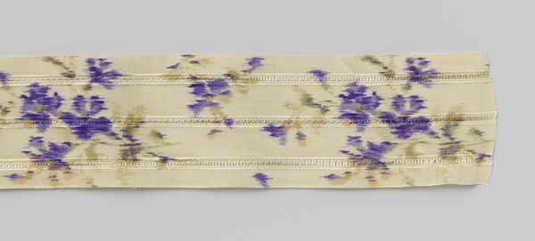 Editor: We’re looking at a piece called "Rol chiné-lint (?) met drie banen ajourwerk en gedrukt bloemmotief in rose, groen en blauw," or roughly, “Rol chiné ribbon with three openwork bands and printed floral motif in pink, green and blue," dating from around 1875 to 1900. It's at the Rijksmuseum. It seems to be textile based. I’m immediately struck by how delicate it is – like a fragment of a lost world of craftsmanship. What historical forces do you think shaped the creation and preservation of a piece like this? Curator: That’s a wonderful starting point. It's crucial to see this textile within the context of the burgeoning industrial revolution. Machine-made textiles were becoming increasingly available and affordable. So, how did pieces like this, crafted with hand techniques, maintain their value? Was it simply nostalgia for pre-industrial crafts? Or does this tell us about social class? Who do you imagine was its audience or intended owner? Editor: That’s interesting – I hadn’t thought about the class element so directly. Perhaps this was a way for the upper classes to still express a commitment to beauty and bespoke creations. Is it fair to suggest this piece became a kind of silent protest to industry? Curator: A silent protest – I like that! Certainly, there was a segment of society that actively resisted the homogenizing forces of industrial production. Pieces like this also acquire value through their institutional context - the very fact that it’s displayed in the Rijksmuseum elevates its status. Think about the museum as a social and cultural arbiter – what statements is it making by showcasing this textile? Editor: So, by displaying it, the museum emphasizes the artistic merit and resists the narrative of mass production. Curator: Exactly. It also reminds us that taste and value aren't simply inherent in the object, but actively constructed and reinforced by institutions. It speaks to the cultural value we place on handicraft and artistic skill when faced with mechanical reproducibility. Editor: This makes me think about its survival – that museums also become spaces that negotiate these narratives of art history and cultural worth, preserving some objects, but not others. Thanks, I’ve really never thought of institutions in this way. Curator: Precisely! And by engaging with those narratives, we begin to see how power shapes what we consider art.