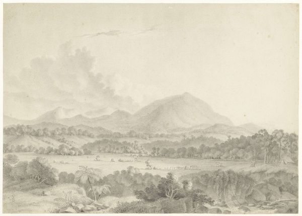 Curator: This is Pieter van Oort’s "Landschap op Java," or "Landscape in Java," created around 1830, using watercolor and pencil. It offers a tranquil, expansive vista. What's your initial reading? Editor: Serene, almost dreamlike. The hazy quality softens the details, giving it a sentimental cast. The careful use of light creates a feeling of immense depth, especially the way the background mountains recede into the mist. Curator: Absolutely. The structure reinforces this. Van Oort has created layers through fields, the river winding to the background and of course the mountains beyond. It all guides the eye purposefully. What stands out to me is the subtle diagonal composition moving upward from left to right that enhances the pictorial organization. Editor: And within those layers are glimpses into life. The figures dotted across the scene—are they workers in the rice fields, perhaps? Or travelers pausing in their journey? I wonder what stories they represent in the context of Java at this time and how that intersects with Dutch colonial influence. Curator: Those tiny figures function as visual keys, opening access points into the broader perspective. It’s the foreground shadow, middle ground texture and atmospheric distant mountains that build an effective scenic design using simple compositional devices. Editor: These figures contribute so much contextually; that is, the image subtly prompts one to imagine their lived experience as part of this environment, hinting at a deeper story beyond the scenic beauty. Water can be an ambiguous signifier in colonial images--renewal and growth on the one hand, exploited resource on the other. The people mediate our reading. Curator: The interplay of form and imagery that you've indicated speaks volumes, then. The composition creates a harmonious whole that moves from shape to subject without losing balance. Editor: Van Oort's "Landscape in Java" gives us access to the visible surface and simultaneously invites us to imagine those symbolic depths; it reveals an intriguing historical perspective in this moment in time. Curator: Yes, through its artistic architecture, Van Oort directs us to our interpretive destination through our observation.