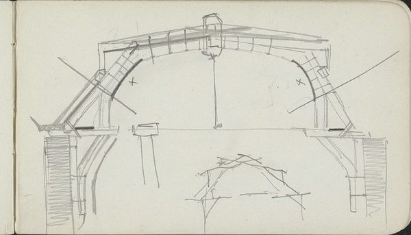 Editor: This is Carel Adolph Lion Cachet's "Gewelf van een kerk," or "Vault of a Church," created between 1905 and 1906. It’s a drawing in graphite and pen on paper, currently held in the Rijksmuseum. It feels like a preliminary sketch, capturing a grand architectural space with these quick lines and shading. What strikes you when you look at it? Curator: What immediately catches my eye is how the artist uses such spare lines to suggest immense weight and volume. We aren't just seeing a vault; we're feeling the accumulated history held within these architectural forms. Think about the symbolism inherent in church architecture itself – the upward reaching lines aspiring to the divine, the enclosed space offering sanctuary. Does the incompleteness of the sketch alter your perception? Editor: I think it almost emphasizes the feeling of it being a personal reflection or study. Because it isn’t fully rendered, it feels less like a presentation and more like an exploration of an idea. Curator: Precisely. Consider how arches have been used throughout history, not only structurally but also symbolically. They represent connection, transition, and even triumph, from Roman aqueducts to Gothic cathedrals. This sketch, though simple, participates in that long visual and cultural dialogue. Do you sense any specific stylistic influences? Editor: I'm not sure. Maybe some aspects of the Arts and Crafts movement with its focus on craftmanship, though it's definitely not as detailed or ornamental as some examples of that. Curator: An interesting observation. Perhaps the sketch suggests an interest in the underlying structure, rather than decorative embellishment. The vault becomes a signifier of permanence and faith through its skeletal representation. It hints at the deeper meanings we ascribe to sacred spaces, even in a fragmented form. Editor: I hadn’t considered it in that way. It makes me think about how even an unfinished drawing can carry so much symbolic weight and cultural memory. Curator: Indeed, this seemingly simple sketch invites us to contemplate the enduring power of symbols and the narratives embedded within architectural spaces. A brief glimpse into a world of meaning.