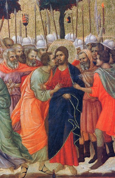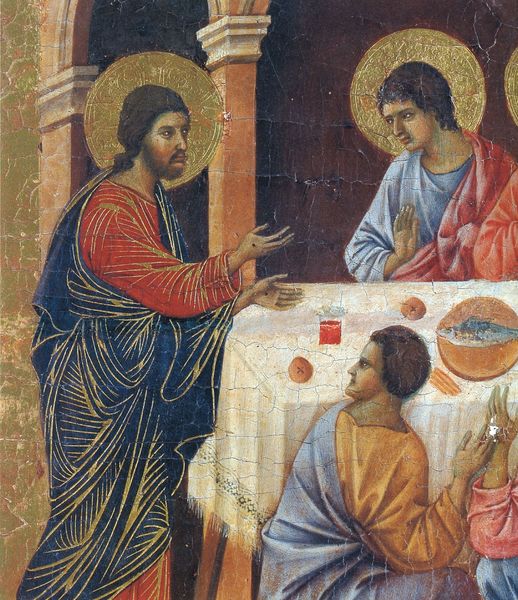 Duccio painted this panel of 'The Washing of Feet' in Siena, Italy, sometime in the early 14th century. It’s a moment taken from the Bible, when Jesus washes the feet of his disciples at the Last Supper. The image is about contrasting social roles. Jesus, the most important figure, is kneeling in the position of a servant before Saint Peter. Peter is shown recoiling, shocked that Jesus would perform such a humble act. This reflects the social codes of the time, where the washing of feet was a task reserved for the lowest members of society. Duccio was commissioned to create this panel for the high altar of Siena Cathedral. The Cathedral was a powerful institution in Siena and controlled much of the city’s wealth and power, which is something to bear in mind when thinking about the painting’s cultural context. To understand Duccio's artistic choices, we can look at how other artists have depicted the same scene, and how the meaning of foot-washing has changed over time, drawing on theological texts and historical accounts. This helps us better understand the power of art to challenge social norms.