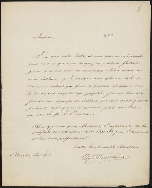 Editor: This is "Brief aan anoniem" by Frederik Hendrik Weissenbruch, possibly from 1869. It’s mixed media – ink and drawing on paper. It looks like a handwritten letter, quite personal in its nature. What stands out to you about this work? Curator: For me, this piece speaks volumes about the socio-cultural context of artistic communication in the 19th century. Think about the role of correspondence before widespread telephones or email. Letters weren't just practical; they were a primary way for artists to engage in dialogue, share ideas, and build relationships. How might this letter shed light on Weissenbruch's network and his reception? Editor: So you’re saying that this isn't just a letter; it's also a record of Weissenbruch’s interaction within the art world. But, because it’s “aan anoniem,” it’s addressed to someone anonymous, does that influence the meaning or value we assign it? Curator: Absolutely! The anonymity adds intrigue, doesn’t it? Was this a critic, a patron, a fellow artist? Consider the power dynamics inherent in that relationship. The act of sending a physical letter suggests a level of formality, and perhaps, a desire for documentation, for posterity even. Could this document illuminate our understanding of his artistic practices, but also its reliance of specific cultural contexts for communication and relationship-building? Editor: That makes me see it in a completely new light. I was focusing on it as simply an intimate note, but its historical context provides another view. Curator: Exactly! By looking at the broader societal and artistic context, this "anonymous letter" gives us very interesting views. I found it interesting, as it emphasizes how important societal structures are to shape not only the artist, but also the value and meaning we ascribe to the art piece. Editor: Me too. I appreciate how you linked art, society and politics in such interesting ways.