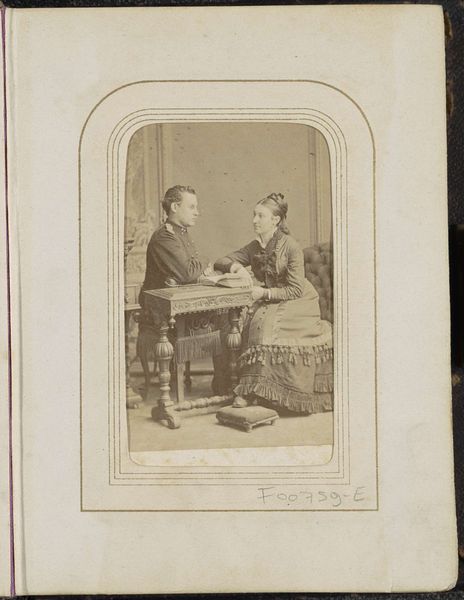 Editor: So, here we have a photographic portrait from around the 1860s or 70s, titled "Portret van een man en een vrouw." It's an albumen print, that sepia tone is so characteristic of the era. There's a certain formality, almost stiffness, to their pose. What stands out to you when you look at this piece? Curator: Stiffness is a great word. To me, the couple’s restrained presentation really speaks to Victorian ideals. There’s such an emphasis on propriety in their clothing and bearing; the woman’s elaborate dress and the man's respectable suit...do you get the sense they were aware of performing for the camera, presenting a particular image? Editor: Definitely! It feels so posed, like they're trying really hard to project a certain image of themselves, maybe for posterity or family. I wonder what their life was *really* like. It’s a little bit…sad, maybe? Curator: It *could* be sad! Or perhaps, beautifully considered? I wonder if that careful composition —the woman standing protectively near her seated companion—doesn't speak volumes. I also wonder, considering they decided on a shared image: did they consider their narratives would forever intertwine? That their existences and afterlives, however anonymous to the wider world, would be linked? It gets you thinking! Editor: I didn’t consider the intertwined narrative. Thinking about this being preserved… Their lives being *bound together*. The photo transforms from something stiff to something profoundly connected. Curator: Exactly. The mundane reveals a deep truth when we sit and give it some attention. It changes how *I* see things, too! Thanks!