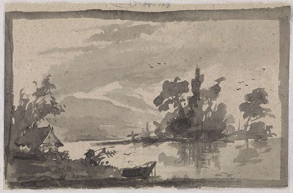 Editor: This is "Moonlight Landscape," a watercolor and charcoal drawing on paper, created by David Cox around the 1850s. It has this wonderfully ethereal, almost dreamlike quality. What symbols do you see within it? Curator: Indeed, the ethereal quality strikes first, doesn't it? That pale crescent… almost an echo of earlier lunar deities, a faint, distant Artemis, perhaps, presiding over human affairs. And look how the city lights glimmer in the distance – little points of civilization holding their own against the vastness. The looming structures in the foreground are like monuments that hint at time and civilization and their ever-changing relations, aren't they? Editor: Monuments as records... what sort of cultural memory does the piece evoke for you? Curator: It makes me think of ruins and how ruins work on our memories – a certain sense of loss, certainly, of things decayed, yet also this incredible sense of endurance. This composition also reminds of "Sublime", something powerful enough to inspire awe and maybe even fear, an aesthetic strategy so pervasive across periods, no? It captures a moment of quiet reflection in the face of something far grander than ourselves. How do those elements sit with you? Editor: It’s fascinating to consider the interplay between vulnerability and power within the symbolic language of ruins and natural phenomena, but it would be very sad if these memories vanished along with the symbols in the course of time! It's funny that such a delicate artwork evokes so much deep, heavy history. Thank you for the lesson! Curator: And thank you, this reminds of our responsibility to unpack the meanings within symbols, keeping cultural memories alive.