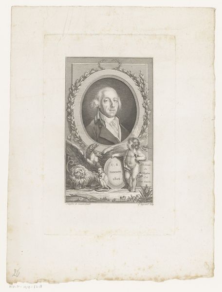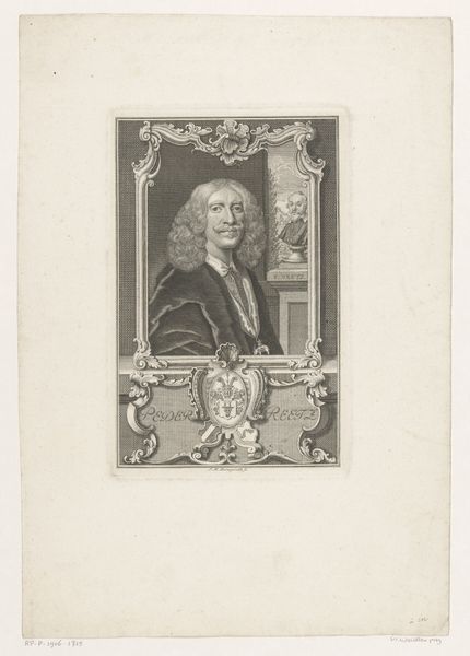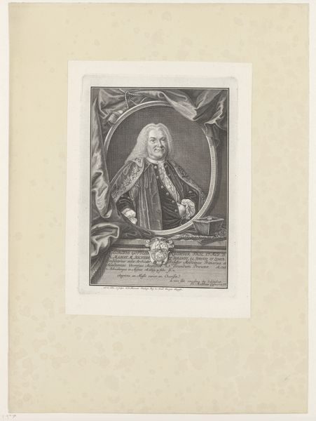 Curator: Well, here we have a fascinating print—an engraving titled "Portret van Johann Christoph Mylius," dating from around 1740 to 1767. It’s currently part of the Rijksmuseum’s collection and was created by Johann Martin Bernigeroth. Editor: My initial impression? Imposing! It's that cool, almost distant gaze, and the wig… Oh, the wig practically screams power and intellect! Makes you wonder what secrets that gentleman held, doesn’t it? Curator: Indeed. Engravings like this were often commissioned to immortalize individuals of stature. What really gets me are the fine lines and detailing; look at the subtle shading on the face and the folds of his robes. It creates such depth despite being a black and white print. Editor: And speaking of folds, notice how they all seem to converge towards the face, subtly leading your eye to his expression. He seems every bit the "Professor" that his inscription indicates, don’t you think? A serious academic with, dare I say, a hint of slyness in his eyes. Curator: Possibly a dry wit? Also, it's easy to overlook, but his family crest displayed just under the portrait tells us something about Mylius and his place in the world. The symbology of the objects arranged could probably open another interpretation of his position in society. Editor: Oh, absolutely. Every visual element has the potential to reveal clues about cultural values of the time. What really holds my attention is the way his gaze seems to penetrate through the centuries. It serves as a visual bridge, a symbolic connection to a time when scholarship and intellectual pursuits carried profound weight. Curator: A potent observation, well made. Seeing as he lived during the enlightenment I imagine a portrait such as this serves not only as memory and physical representation but perhaps the image acts a lasting embodiment of humanistic ideals. Editor: Yes, reflecting on this engraving certainly opens a window to consider the individual's persona and wider culture. A thoughtful character study preserved in ink.