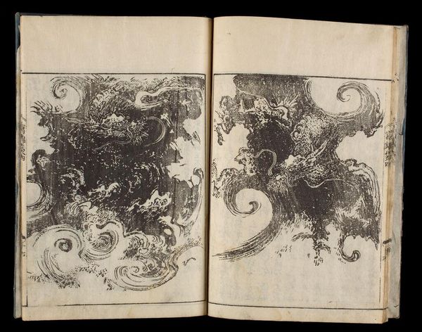 Curator: This is a page from Katsushika Hokusai's "Illustrated Narratives of the War of Han and Chu," Volume 2, held at the Harvard Art Museums. The swirling ink work really captures the epic scale of the battles. Editor: Immediately, I am struck by the visual drama! The dragon-like figure on the left contrasts with the warrior on the right, and both evoke a sense of tumultuous power. Curator: Right, and that power comes through Hokusai's expert use of woodblock printing. Think of the labor involved in carving those intricate lines and the cultural demand for these illustrated narratives during that period. Editor: Absolutely. Beyond the material process, the dragon itself is potent East Asian symbol. It represents strength and perhaps even the divine mandate to rule. The warrior on the right is a clear embodiment of martial prowess. Curator: Precisely. The book format also implies a personal, domestic consumption. These weren't monumental public works, but intimate objects. Editor: Seeing these figures locked in a visual struggle really emphasizes how symbols carry weight across generations, shaping our understanding of conflict. Curator: It's amazing how the texture and line work give form to a narrative that is both material and symbolic. Editor: Indeed. Each glance unlocks new layers of meaning, connecting us to cultural memory in fascinating ways.