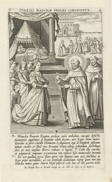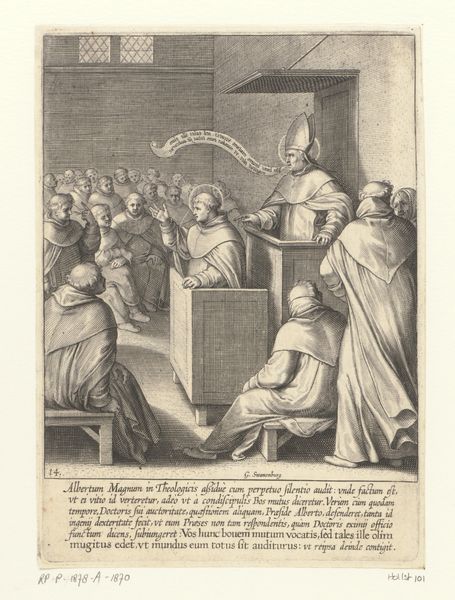 Curator: Looking at this print, the atmosphere feels decidedly formal. Stark, even. Editor: Well, let's place this engraving first. This intaglio print, made between 1630 and 1641 by Luca Ciamberlano, depicts Filippo Neri receiving permission from Pope Gregory XIII to found the Oratorian order. Curator: Right, that's the historical event displayed. I immediately pick up on how Neri's kneeling posture is indicative of the clear power dynamic at play here, emphasizing the authority vested in the papacy. Editor: And the setting, a rather austere papal chamber, certainly reinforces that power structure. Note how the figures are positioned-- Gregory XIII enthroned, surrounded by his cardinals, while Neri kneels with the documents affirming his order. This isn’t just about individual piety, it’s about the institutional backing. Curator: Precisely, we see the social role of art visualized here as it becomes the perfect tool to further ideas that endorse institutional frameworks. It speaks volumes about the church’s investment in controlling spiritual practices through sanction and documented allowance. Editor: Though monochromatic, Ciamberlano does use light and shadow to create depth. Do you think the baroque style influences this kind of chiaroscuro for political gain as well? To better dramatize the legitimacy of papal law and create religious devotion? Curator: Undoubtedly. I believe Neri's subtly illuminated face is framed almost heroically as he pledges submission. Consider, too, the print's dissemination - an effective tool to educate or perhaps indoctrinate broader audiences about hierarchical social order, obedience, and devout practice. The narrative reinforces these things through an appeal to historical events, right? Editor: The engraving, a reproducible medium, was likely intended for circulation amongst the clergy and faithful alike, and maybe as part of a broader propaganda campaign that supported the expansion and formalizing of various religious orders during that time. What I am interested in knowing is whether prints like these affected people of different social classes and religious groups in distinct ways, or was its impact overarching despite different positionalities? Curator: An important question, one that shows just how crucial it is to consider reception alongside intention when engaging with historical visual media like this one. Editor: A productive exploration indeed, illuminating the multiple functions art could serve in seventeenth-century Rome.
