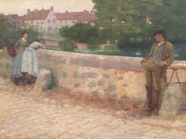 Curator: This oil painting by Anders Zorn, titled "A Fisherman," completed in 1888, presents us with a contemplative scene. It seems to immediately establish a slightly somber mood, doesn't it? There's a certain stillness. Editor: Yes, a definite quietude. The muted color palette really sets the tone, almost like a hazy memory. The texture of that stone wall looks skillfully rendered and really prominent. Curator: Zorn’s process here is fascinating; he often worked en plein air, meaning he painted directly from life, outdoors. This captures an intimate moment of everyday life for the working class and is impressionistic in its loose brushwork. But one wonders about his relationship to the fisherman, positioned in contrast to the genteel woman he is accompanying. Editor: It is really compelling to consider the dynamics at play. Note how they’re positioned, seemingly side-by-side, yet with a tangible distance. There is her fashionable, frilled dress against the worker's worn clothes: the class contrast and social positioning cannot be missed. The scene reads as deeply observational. Is Zorn merely capturing an image or offering a nuanced social commentary on societal disparity and roles? Curator: Absolutely. And to examine Zorn’s access—his social standing as a successful artist would have allowed him access to capture these scenes and details. Consider, too, the commodification of labor as artistic subject. This ‘fisherman’—his labor, his body—becomes the raw material, translated through Zorn's process of painting into a consumable image. Editor: Yes, this speaks volumes, doesn’t it? How does Zorn’s privileged position influence the way we perceive and understand these figures? He is painting labor and class; can this be viewed outside its inherently political dimensions? Curator: Those very tensions become the raw materials for further consideration and analysis. Thanks for lending that additional perspective, that helps us explore the painting so well. Editor: A privilege, as always, to delve a bit deeper! It is a conversation well worth continuing!