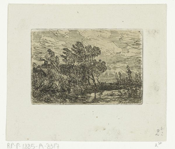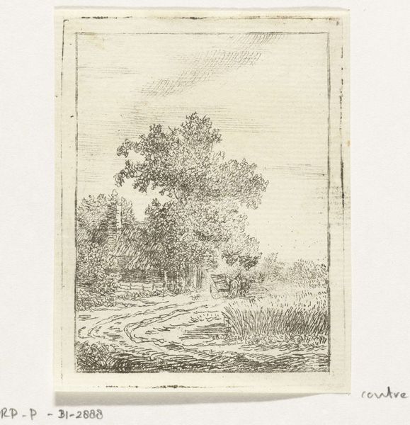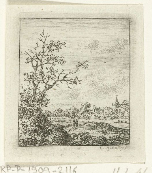 Ernst Willem Jan Bagelaar created this tiny landscape with a church tower sometime in the late 18th or early 19th century, using the printmaking technique of etching. In etching, a metal plate is coated with a waxy, acid-resistant substance called a ground. The artist scratches an image into this ground, exposing the metal. The plate is then immersed in acid, which bites into the exposed lines. The longer the plate sits in the acid, the deeper the lines become. The plate is then inked, and the surface wiped clean, leaving ink only in the etched lines. Finally, paper is pressed against the plate, transferring the ink to create the print. Bagelaar likely used a variety of tools to create this image, from etching needles to burnishers. The image depicts a serene landscape, complete with trees, figures, and a church in the distance. The level of detail in such a small format is impressive, and speaks to the skill and labor involved in the etching process. By focusing on the materials and making of this print, we gain a deeper appreciation for the skill and artistry of Bagelaar, and challenge the traditional divide between fine art and craft.