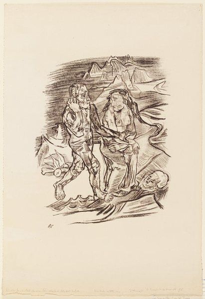 Editor: This is "Man and Wife Walking Over a Corpse," a 1914 lithograph by Oskar Kokoschka, housed at the Minneapolis Institute of Art. The harsh lines and bleak imagery really create a feeling of despair. What's your take on this piece? Curator: This work, made on the cusp of World War I, isn't just despairing; it’s a brutal commentary on relationships amidst societal collapse. The corpse is both literal and metaphorical—a symbol of destroyed intimacy, perhaps? How does Kokoschka challenge traditional portraiture with this stark representation? Editor: I guess portraiture usually tries to flatter the subjects. Here, they both look pretty grotesque! Do you think it's meant to be a specific couple, or more of a generalized statement? Curator: Knowing Kokoschka, there's likely a personal element here. He had turbulent relationships, and his work often explores the darker sides of human connection. But even if it is personal, it also serves as a broader indictment. How might we interpret this piece through a feminist lens, considering the power dynamics represented? Editor: I hadn’t thought of that. The woman does seem to be… almost dragging behind the man. And the title definitely implies ownership. Curator: Exactly. Kokoschka seems to be questioning the societal roles that contribute to these fractured relationships and highlighting the anxieties around masculinity and femininity in a changing world. He does not only portray; he actively critiques. What is the artwork asking of us? Editor: That's really powerful. I initially just saw it as depressing, but it’s clear that Kokoschka is aiming for something much deeper, questioning established social norms and individual agency. Curator: Precisely! Art like this forces us to confront uncomfortable truths and challenges us to actively re-evaluate how power operates within relationships and society as a whole. I’m leaving with new questions to think about!